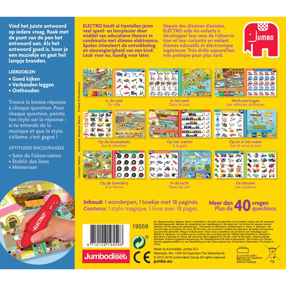 Met deze Jumbo Electro wonderpen-set zullen kinderen veel plezier hebben wanneer zij leren. Met deze educatieve set maakt je allerkleinste kennis met voertuigen in de stad, op zee, in de lucht, op het station en nog veel meer! Laat je kind het juiste antwoord vinden op elke vraag en met de punt van de pen het antwoord aanraken. Er speelt een leuke muziek af en het lampje gaat branden als het antwoord goed is. Deze superleuke educatieve set bestaat uit achttien kaarten en meer dan 40 opdrachten, gebundeld in een handig boekje met ringband. Zo kan je kindje dit Jumbo Electro-spel overal mee naartoe nemen.