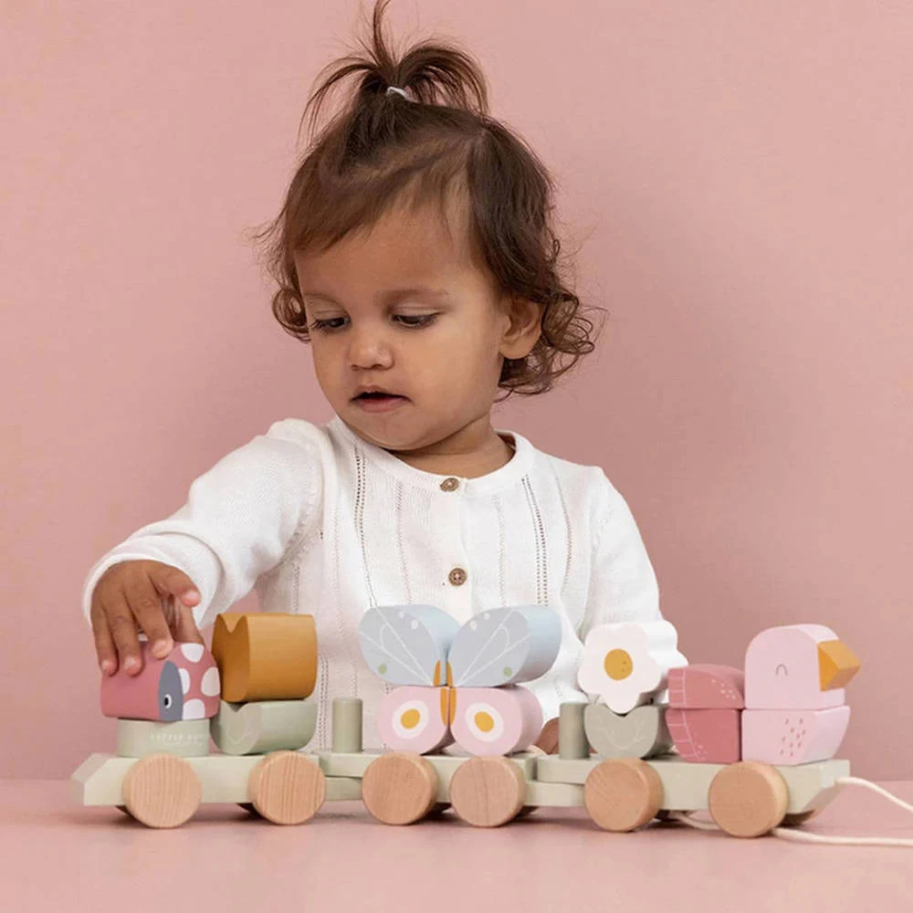Volop speelplezier met deze Little Dutch Flowers & Butterflies FSC blokkentrein! Deze houten trein is klaar voor een nieuw avontuur in de bloeiende tuin. Het roze vogeltje Olivia laat je de mooiste bloemen en vlinders zien. Gebruik je fantasie om met behulp van de stapelblokken in verschillende vormen en dromerige kleuren de trein te bouwen. Er zijn drie koetsen om te stapelen met een vogel, bloemen, een vlinder en een lieveheersbeestje. Daag je kleintje uit om verschillende combinaties te maken om de hand-oogcoördinatie en fijne motoriek te ondersteunen. Het is ook een leuk accessoire voor de kinder- of speelkamer.