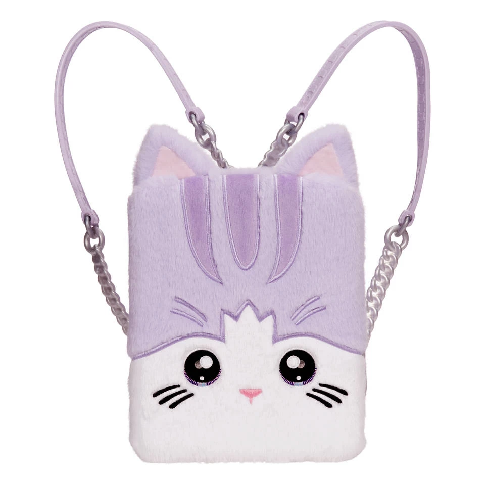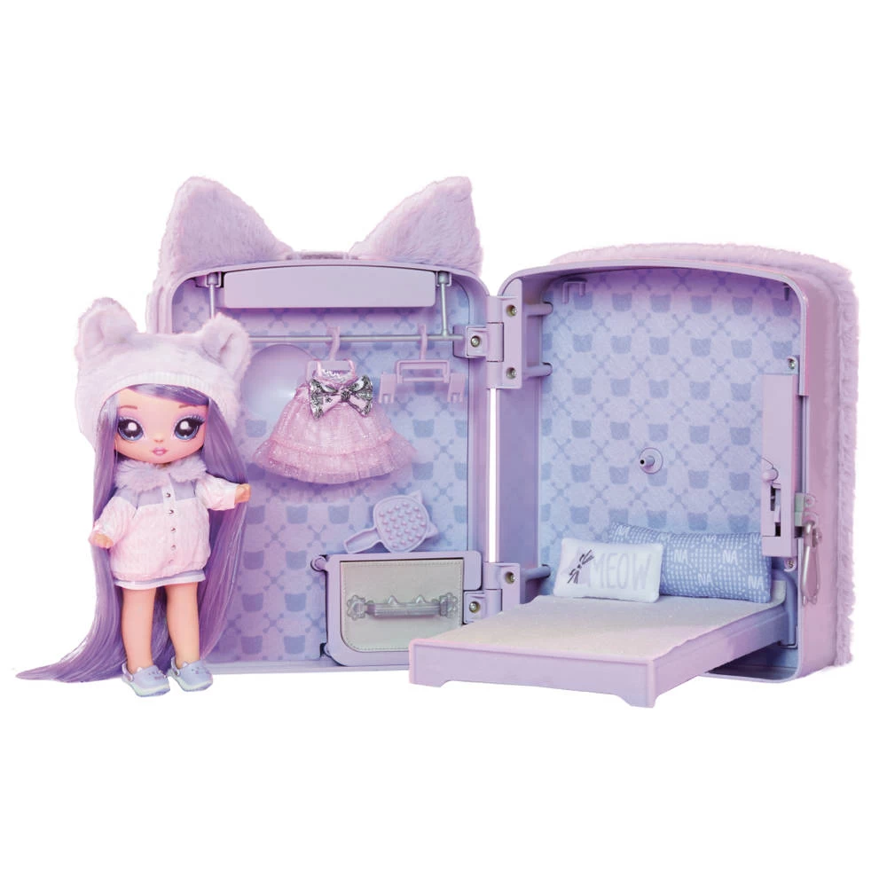 Pak de supermodieuze Na! Na! Na! Surprise Backpack Bedroom serie 3 speelset uit van Maya Whiskerfull. Een 3-in-1 schattige, zachte speelset met een stijlvolle rugzak, een schattige slaapkamerspeelset met kast en een Limited Edition modepop van Maya. De prachtige rugzak is zacht en pluizig en past bij de speciale pop. Open de tas om een slaapkamerspeelset te onthullen met een uitklapbaar bed, een kast met echt werkende lades, kussens, een deken en kledinghangers. Dat Maya van paars en katten houdt is wel duidelijk. Deze fashionista draagt een prachtige, paarse jas en een bijpassende kattenmuts. Zelfs de koffer heeft kattenoren!