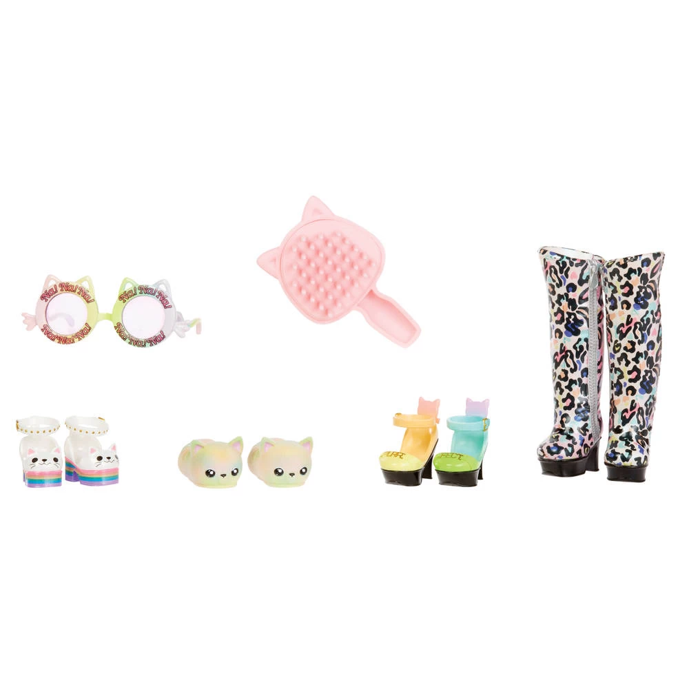 - Mix en match mode en creëer 100+ looks! Met regenboogjurk, pluizig jack, glittertop, glam-rok, zacht sweatshirt, 4 paar schoenen, pluizige kittenhoed/-pet en zonnebril.