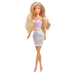 - De pop draagt een schattig pakje met een beertje erop.