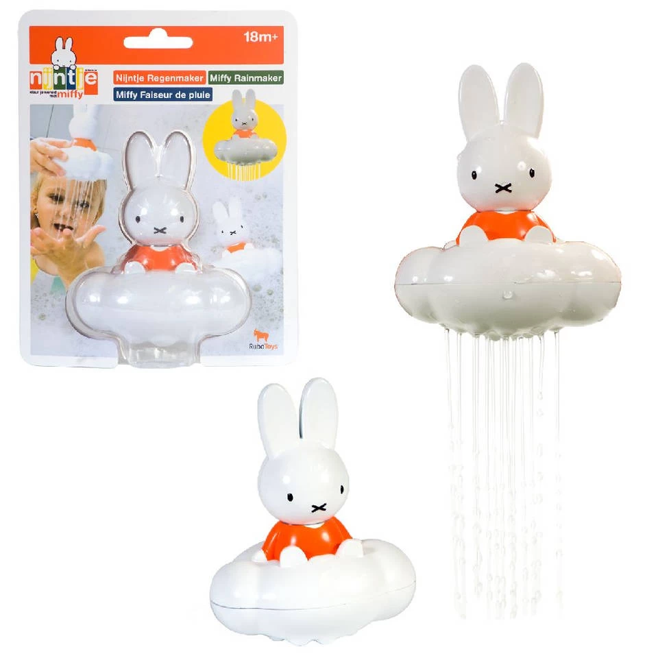 De Nijntje regenmaker laat het regenen in bad. Houd Nijntje een paar tellen onder water en vul de regenwolk. Haal Nijntje weer naar boven en laat haar hoofdje los. Het regent in bad. De regenwolk is open te maken, waardoor je deze gemakkelijk schoon kunt maken.