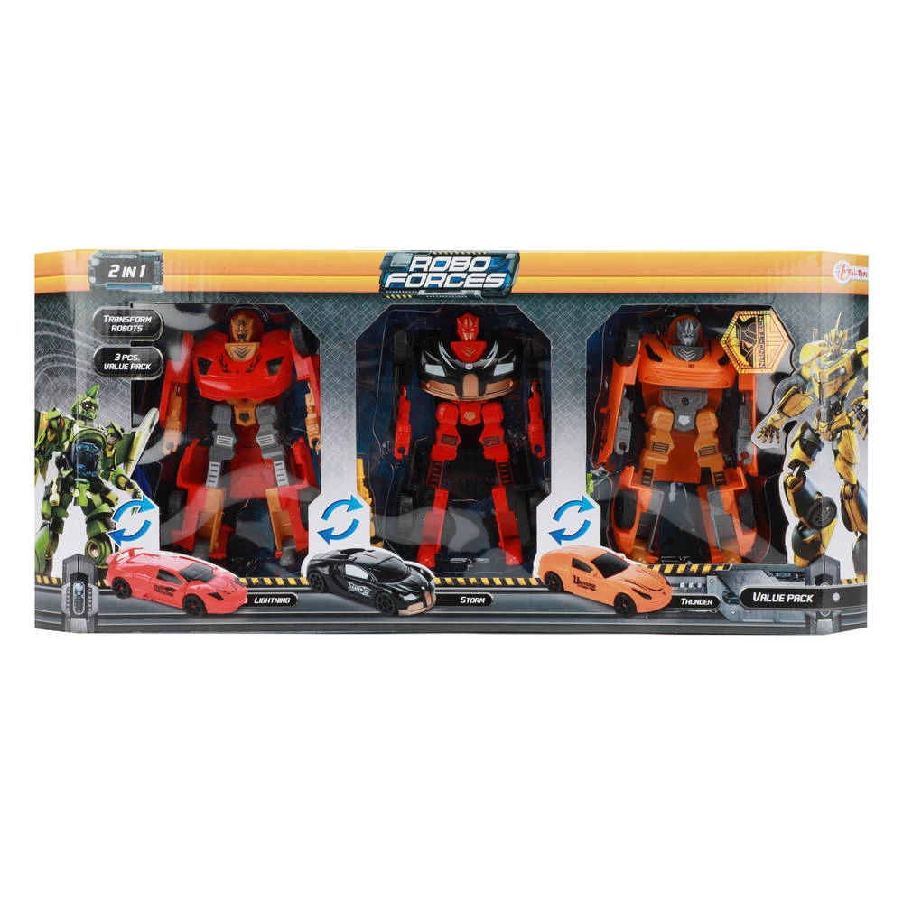 Met deze set heb je niet één, maar drie superstoere robots. Deze robots kun je probleemloos transformeren in een auto. Gebruik je kracht om de vijand te overmeesteren en transformeer in een stoere auto om het volgende avontuur op te zoeken. De auto’s zijn 10 centimeter groot.