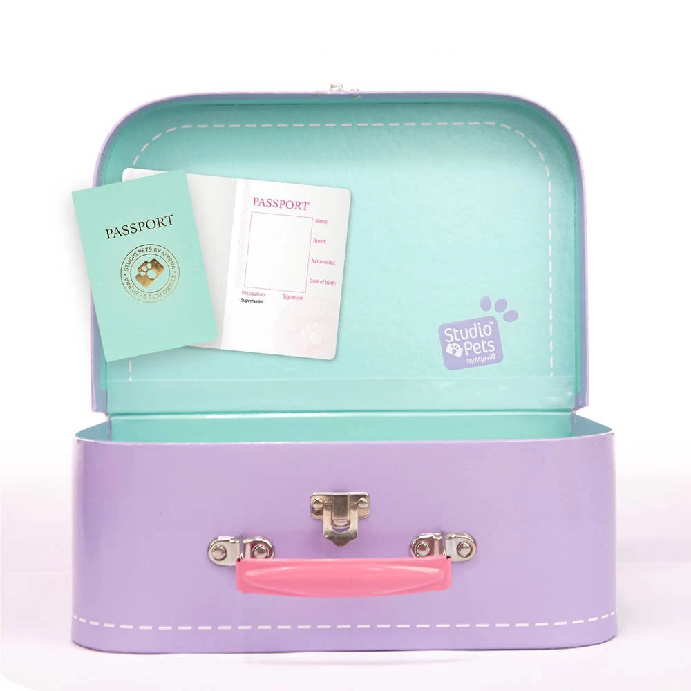 Deze prachtige lila koffer is uitermate geschikt voor een Studio Pets knuffel van 23 cm. Op die manier kan je je favoriete knuffel gemakkelijk overal mee naar toe nemen. De koffer wordt geleverd met een blanco paspoort speciaal voor jouw knuffel. Het koffertje is gemaakt van hoge kwaliteit karton.