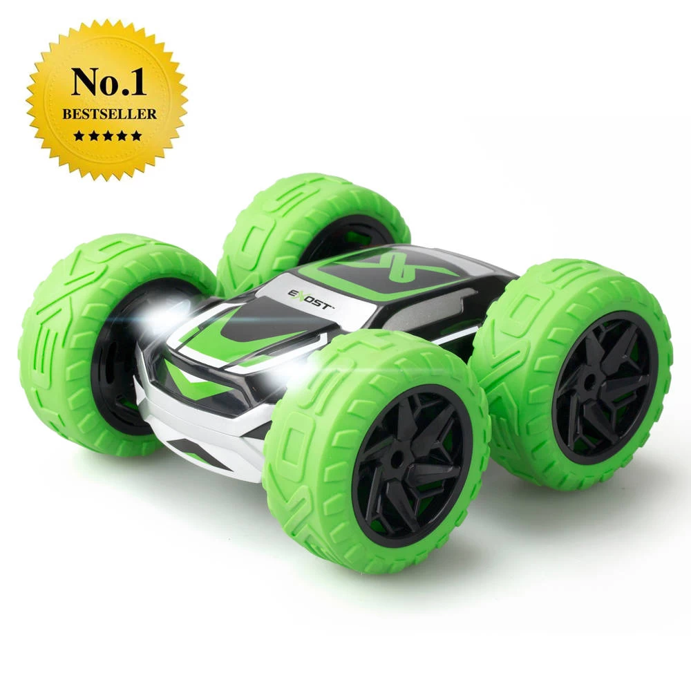 Deze supergave Exost 360 Cross stuntauto kan met zijn grote groene banden spinnen op 360 graden en overwint zo alle hindernissen! Bliksemsnelle versnelling met de controller. De ultraduurzame banden kunnen alle ondergronden aan. De 360 Cross kan op twee kanten rijden en neemt feilloos alle hindernissen!