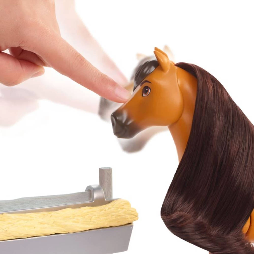 Met deze speelset beleef je de vriendschap, de moed en het avontuur uit de DreamWorks animatiefilm Spirit Untamed! Het Voorgoed Vrij Spirit paard van ongeveer 20 cm bevat alle actie en opwinding uit de film en beschikt over een realistische loopfunctie. Plaats het paard op de vlakke ondergrond en activeer de knop. Verzin de leukste avonturen met dit mooie paard dat voorzien is van grappige hinnikgeluiden, lange mooie manen en een prachtige staart. Spirit wordt geleverd met een hek en een hooibaal voor springactie plus een borstel voor haarverzorging en appelsnoepjes! Kinderen zullen dol zijn op het veelzijdige speelplezier dat ze aan dit prachtige paard uit de film kunnen beleven, van actie tot spelen met haar.