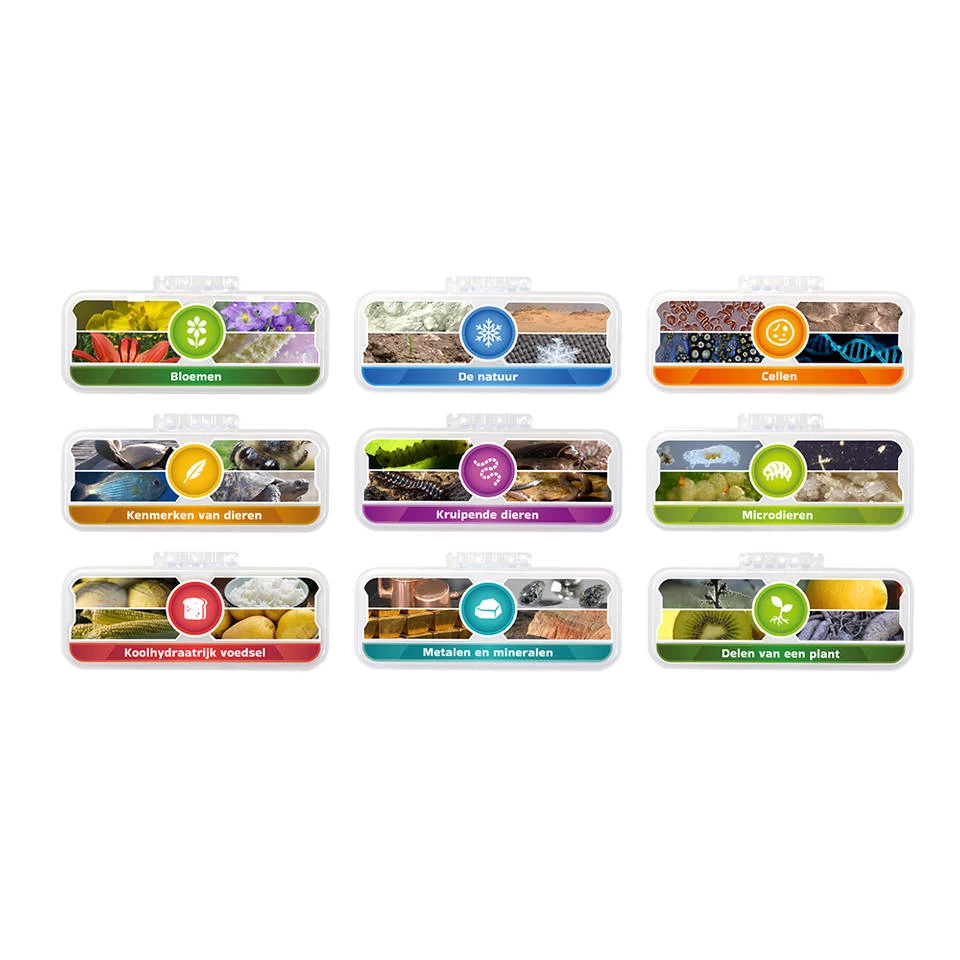 - De microscoop bevat negen dubbelzijdige Smart Slides met verschillende onderwerpen zoals bloemen, voedsel, cellen, kruipende dieren en nog veel meer.